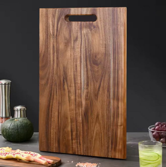 Acacia is honest about what it is. The grain does not hide — honey gold and dark brown in long parallel stripes. Every board is different. Every board is unmistakably itself. Dense, naturally moisture-resistant, and forgiving to own and care for. It will mark from daily use and look better for it. — Dimensions: three sizes available — see options above Construction: Edge grain Finish: Food-safe mineral oil Engraving: BORTOM, bottom edge — Care: Oil once a month. Hand wash only. Dry upright.
